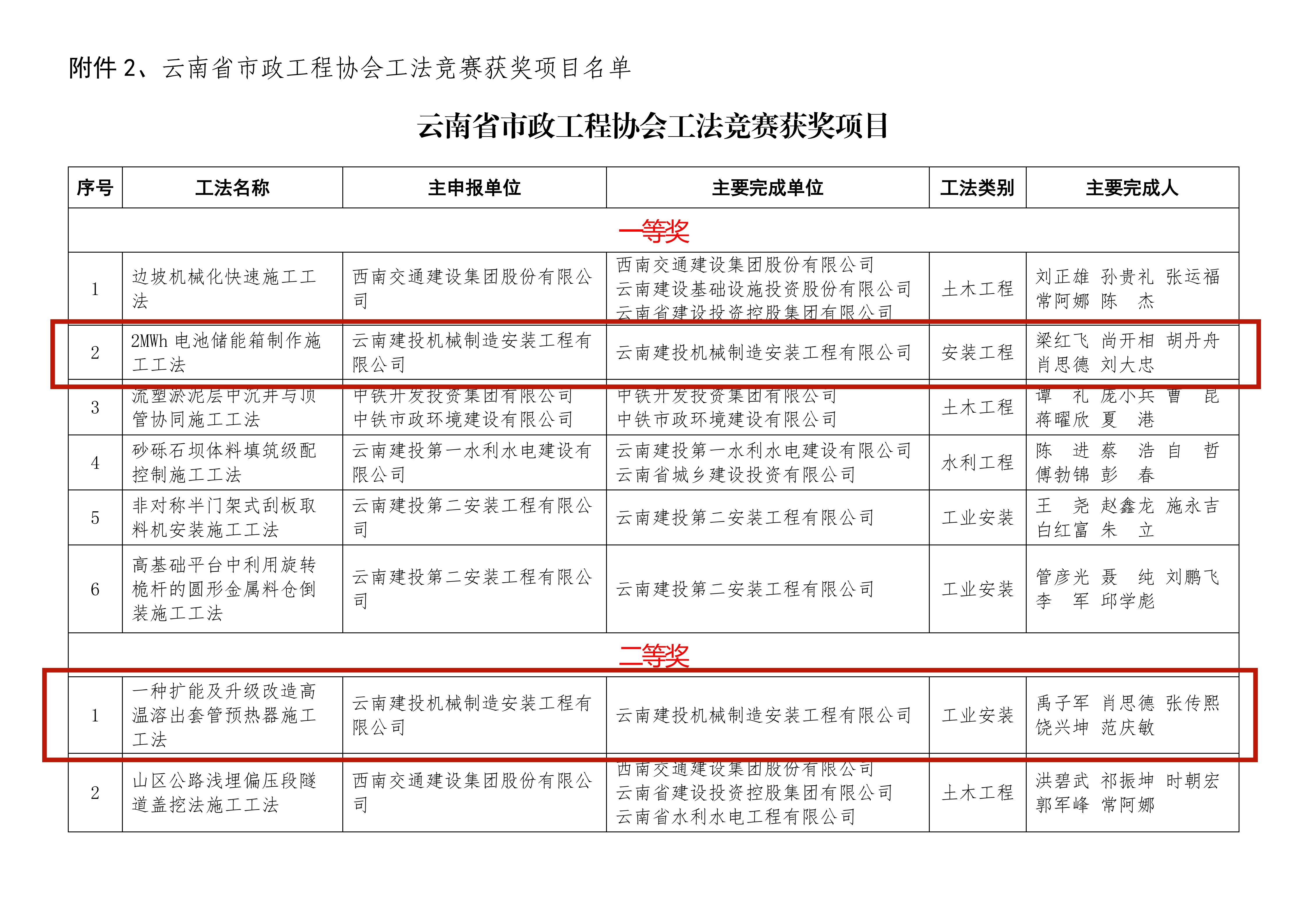 近日,云南省市政工程協會印發了《關于公布2025年度云南省建設行業微創新大賽、云南省市政工程協會工法競賽獲獎項目的通知》,公司兩項工法獲云南省市政工程協會工法競賽獎項。一等獎:《2MWh電池儲能箱制作施工工法》二等獎:《一種擴能及升級改造高溫溶出套管預熱器施工工法》《2MWh電池儲能箱制作施工工法工法》為滿足大容量鋁基鉛